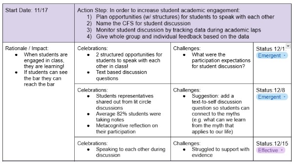 The artifact is an action step from one of my coaching trackers for a teacher with a high percentage of multilingual learners (MLLs) in her AP English Literature class who had not engaged them effectively in discussion, aligning with Principal Quality Standards II (Instructional Leadership), III (Management for Learning), EL 5.9 (Creating Equitable and Inclusive Learning Environments), and EL 5.12 (Using Data to Drive Improvement). This artifact is important because it represents the practical application of data-driven coaching to address equity gaps in classroom practice, specifically ensuring that multilingual learners have meaningful access to rigorous academic discourse. As Bambrick-Santoyo (2018) reminds us, data-driven coaching is essential to school improvement and should be the first step in any improvement plan. This artifact demonstrates my growth in implementing systematic coaching cycles that use data to identify problems, set targeted action steps, and monitor progress toward equity-focused goals. Initial observation data revealed that during a three-minute class discussion, only 5 of 14 students spoke, and 50% of the talking was done by the teacher at a Depth of Knowledge level 2, indicating both limited student engagement and lower cognitive demand. Through the first three weeks of the six-week coaching cycle, I progress-monitored this action step, and after the teacher demonstrated mastery, we shifted focus to building structured student talk routines into the curriculum to further support all learners. This progression illustrates my development as an instructional leader who can use iterative coaching processes to move teachers from basic engagement strategies to more sophisticated, equity-centered instructional practices that ensure all students, particularly multilingual learners, have access to high-level academic discourse.